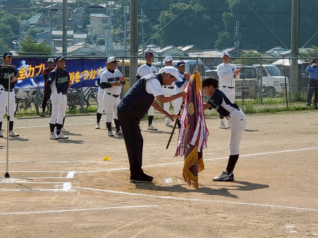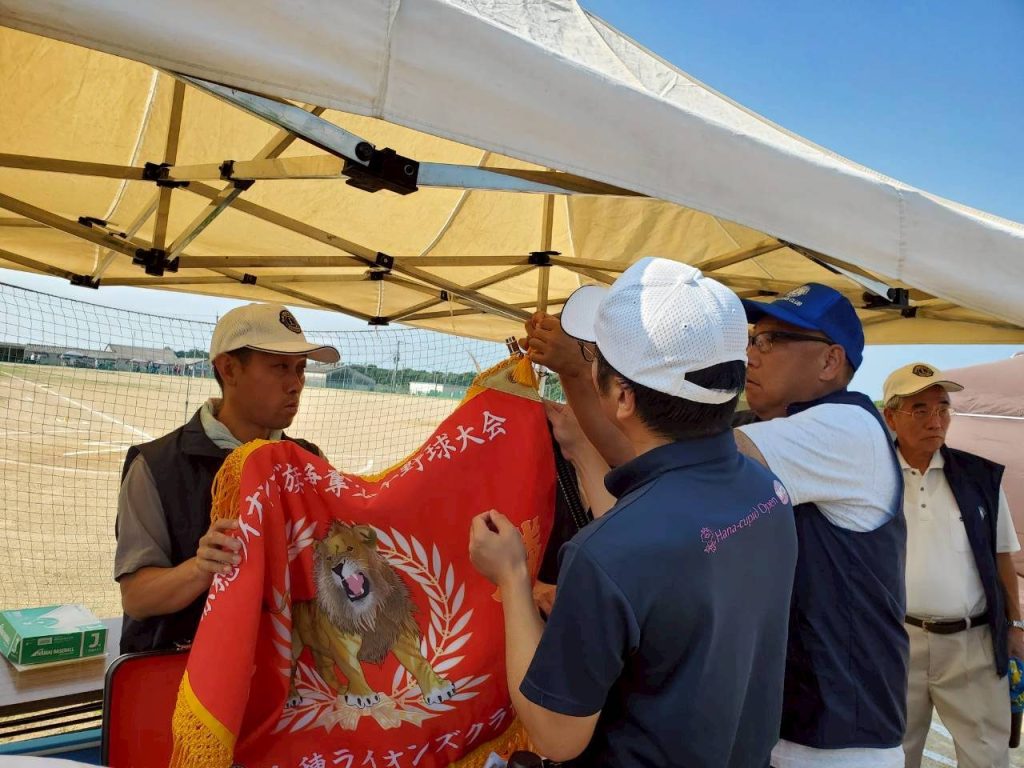 31日の開会式では、新調した優勝旗の贈呈が行われ、備生会長による始球式で熱戦の幕が切って落とされました。大変暑い中ではありましたが、出場チームの皆さんは一生懸命にプレーされていました。