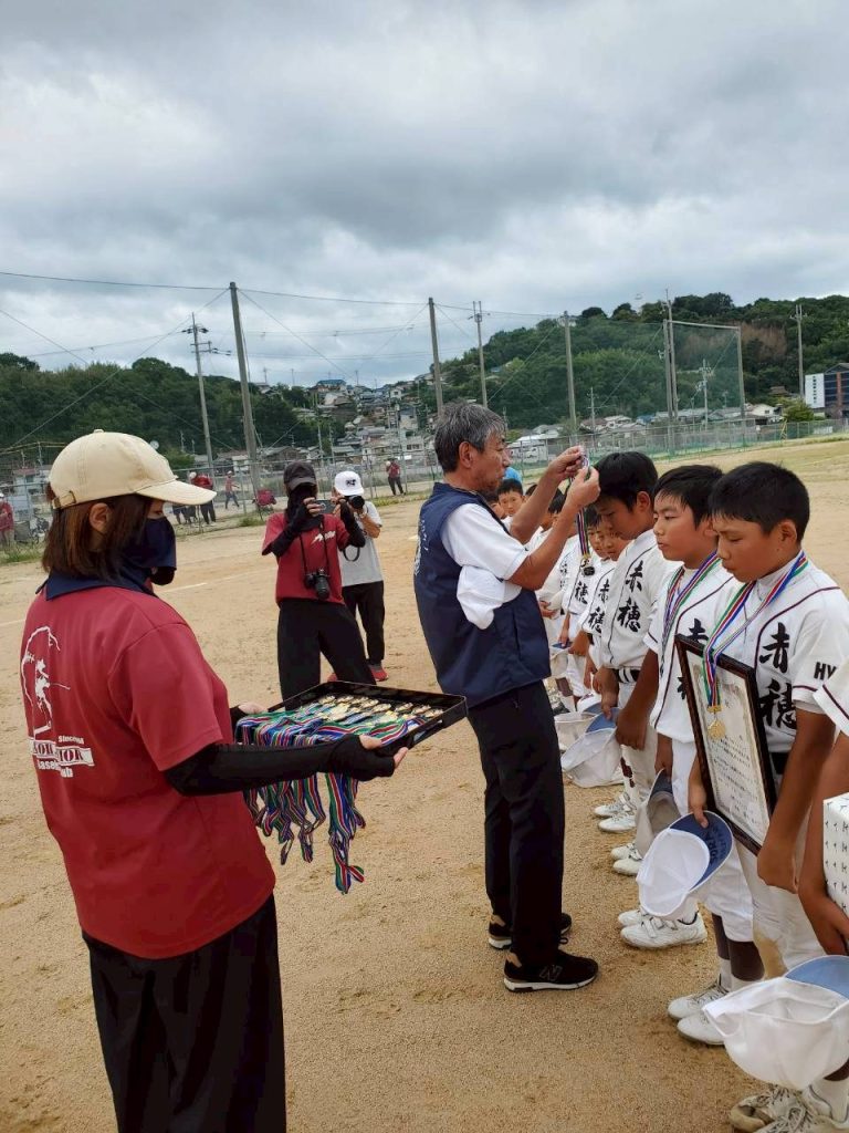 11月に開催される県大会に出場するそうです。閉会式では、備生会長から新調した優勝旗が赤穂野球スポーツ少年団へ手渡されました。あいにくの曇り空でしたが暑さも和らぎ、秋風が心地よかったです。二日間にわたり参加いただきましたメンバーの皆様、有難うございました。