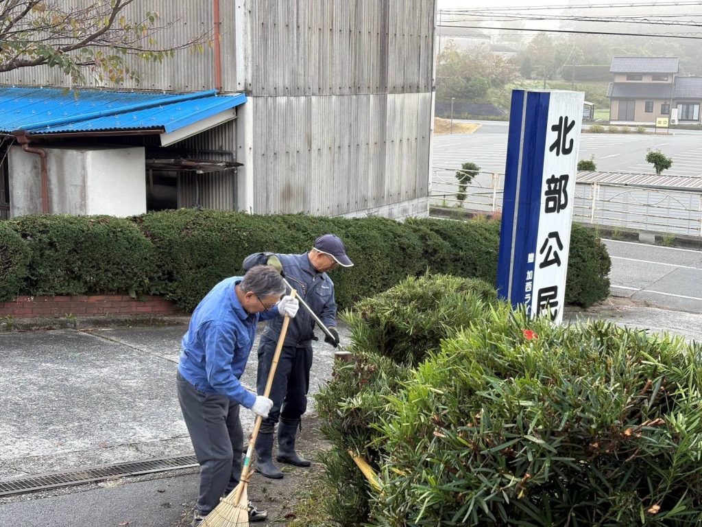 次週に開催される北部公民館ふれあいの祭典に来られる方々が気持ちよく思われるように、樹木の剪定、落ち葉拾い、草刈りなどをしました。