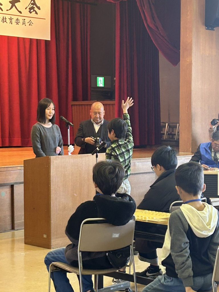 0名の参加者が三木市を中心とした各地より集まり、熱戦を繰り広げました。小学校低学年・高学年、中学生の部それぞれで優勝・準優勝・三位を決定。女流棋士二段の長谷川優貴プロをお呼びし、会員7名が観戦・運営協力、またそれぞれの親たちが応援し見守りました。