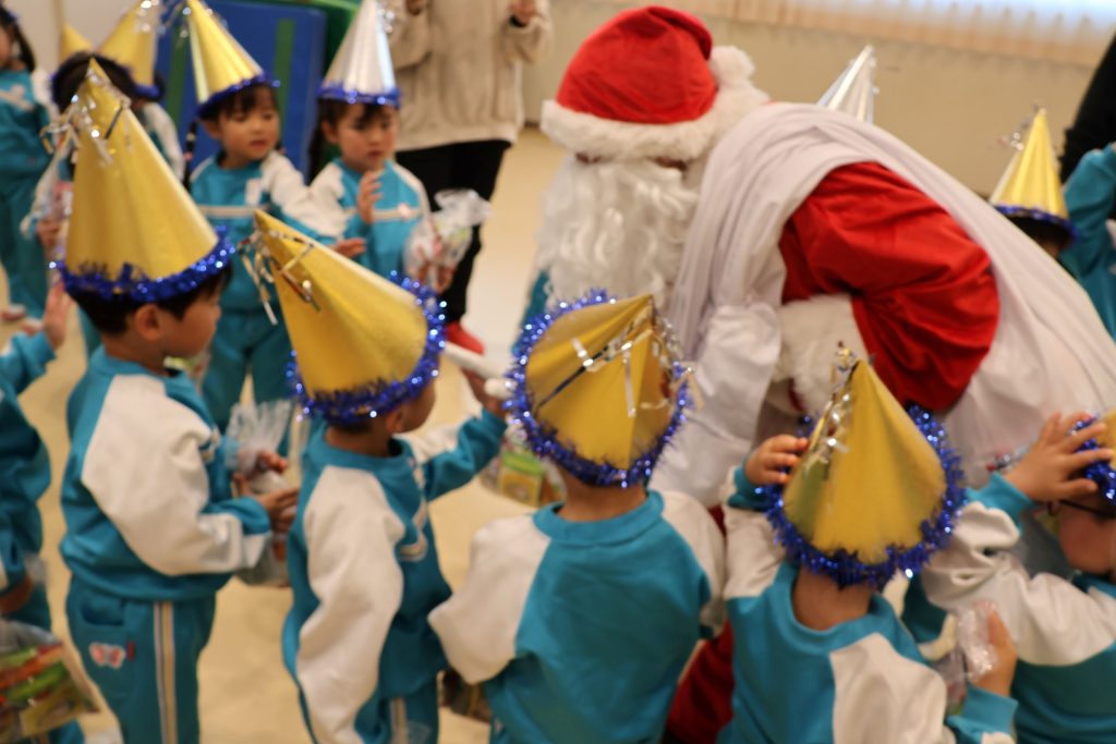 名の園児達にプレゼントとしてお菓子ととんがり帽子を渡し、マジックや腹話術、クイズをして子供たちと交流し、楽しい時間を過ごしました。